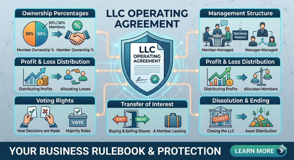 An LLC Operating Agreement is the “rulebook” for a Limited Liability Company. While a Business License or Articles of Organization register your company with the state, the Operating Agreement is a private internal document that outlines how the business is actually run, who owns what, and how decisions are made.Think of it as a prenuptial agreement for business partners—it’s much easier to decide what happens during a “divorce” or a crisis while everyone is still on good terms.